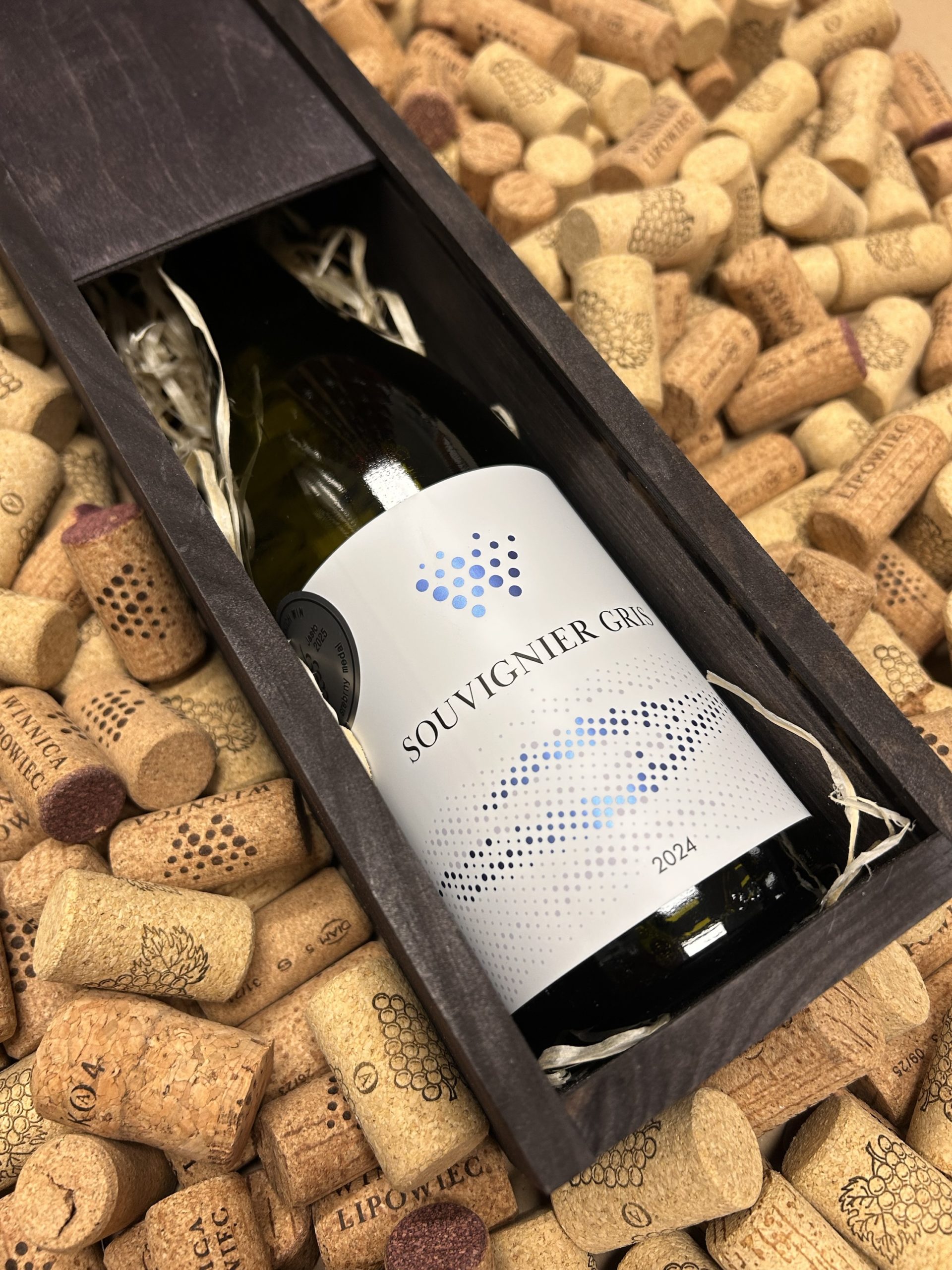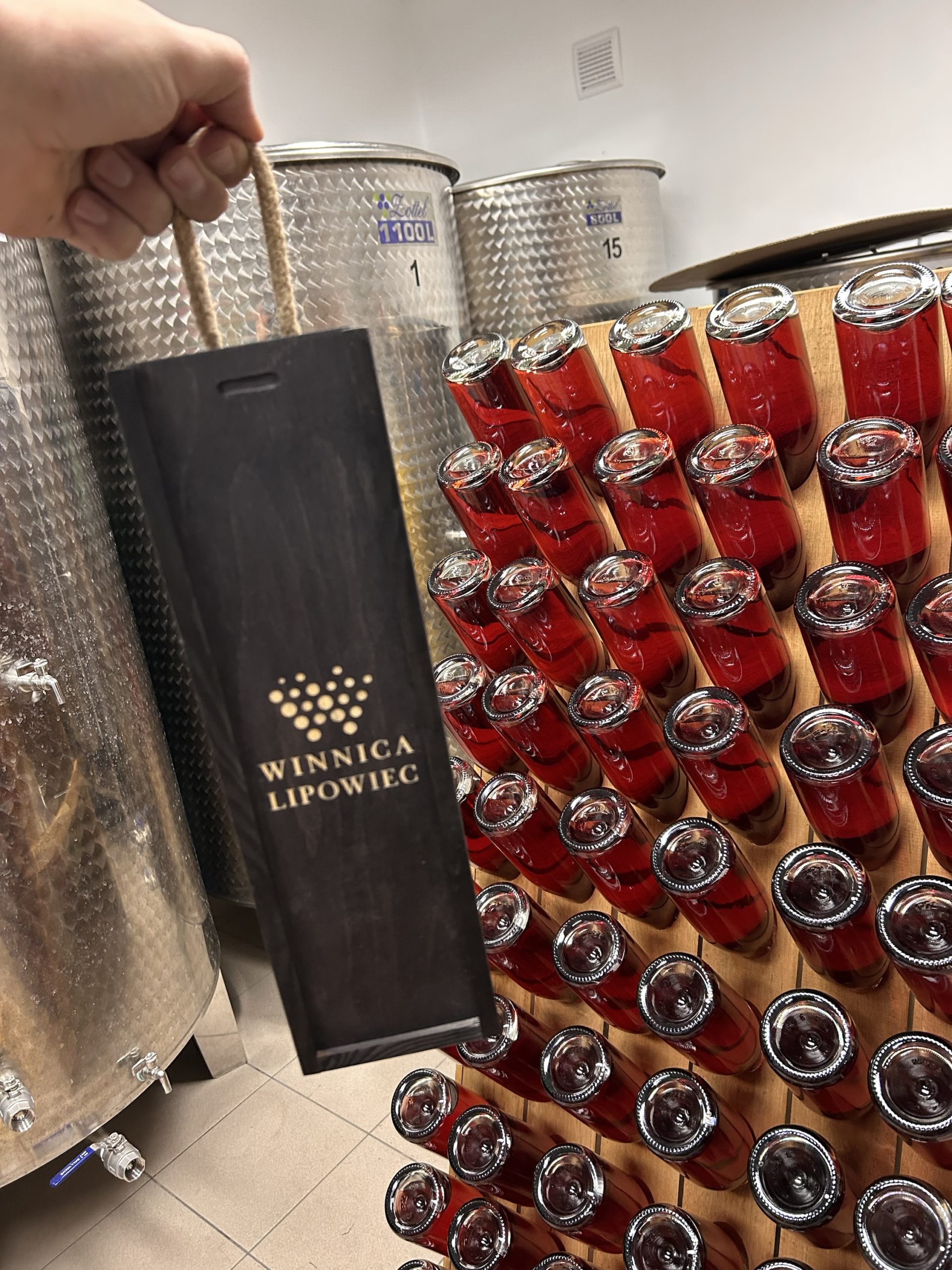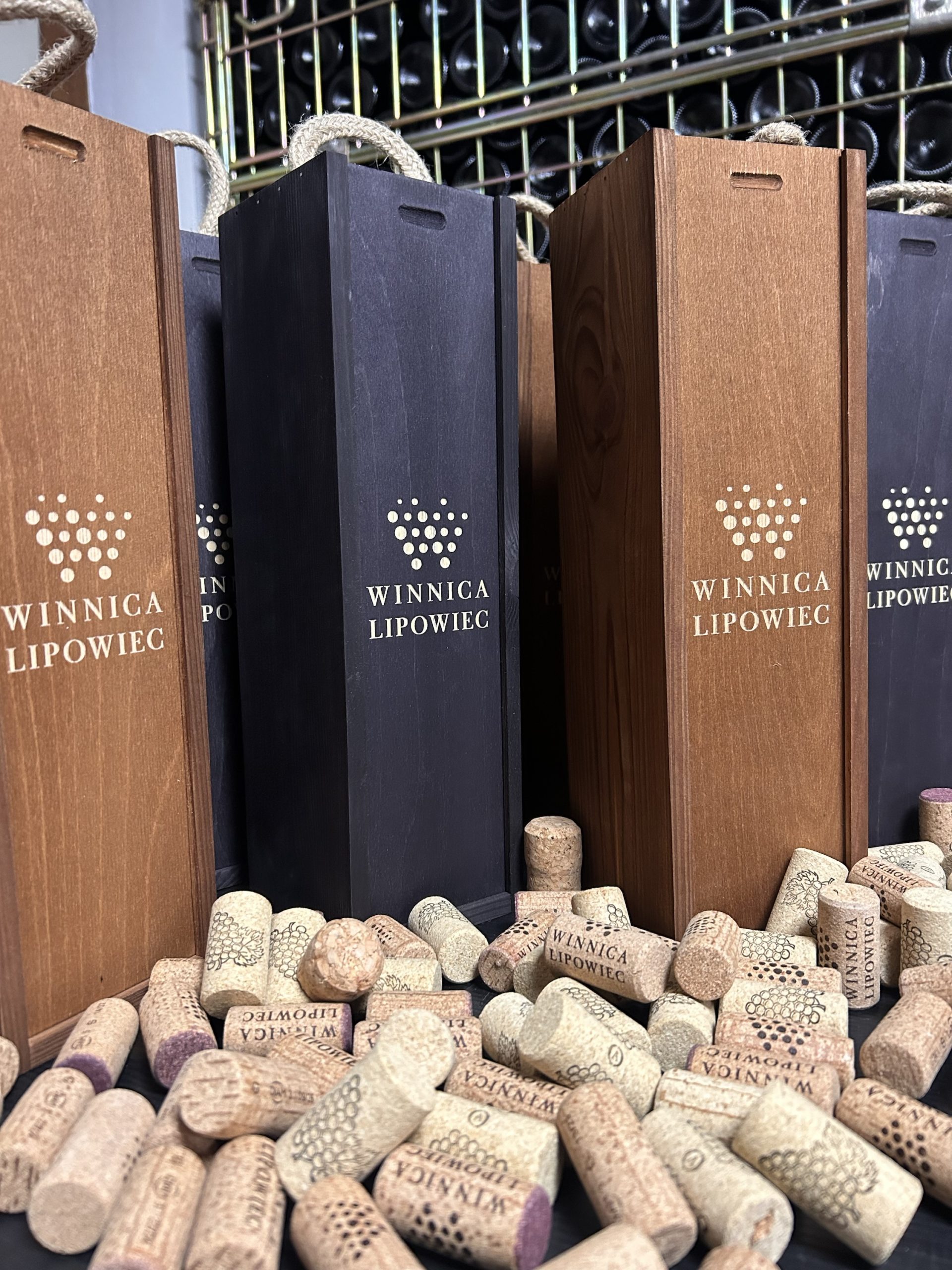 Drewniana skrzynka upominkowa z logo Winnica Lipowiec.